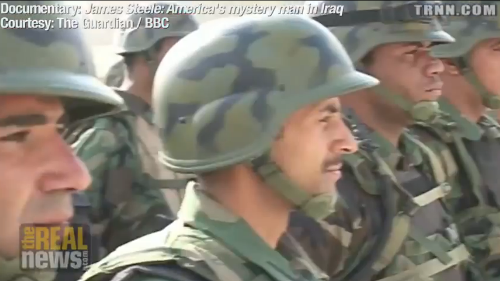 This is the only known Iraqi video footage of Steele, a shadowy figure always in the background observing, evaluating. The man on his left is his collaborator, Colonel James Kaufmann. He reported directly to General David Petraeus, who funded this police commando force from a multibillion dollar fund.